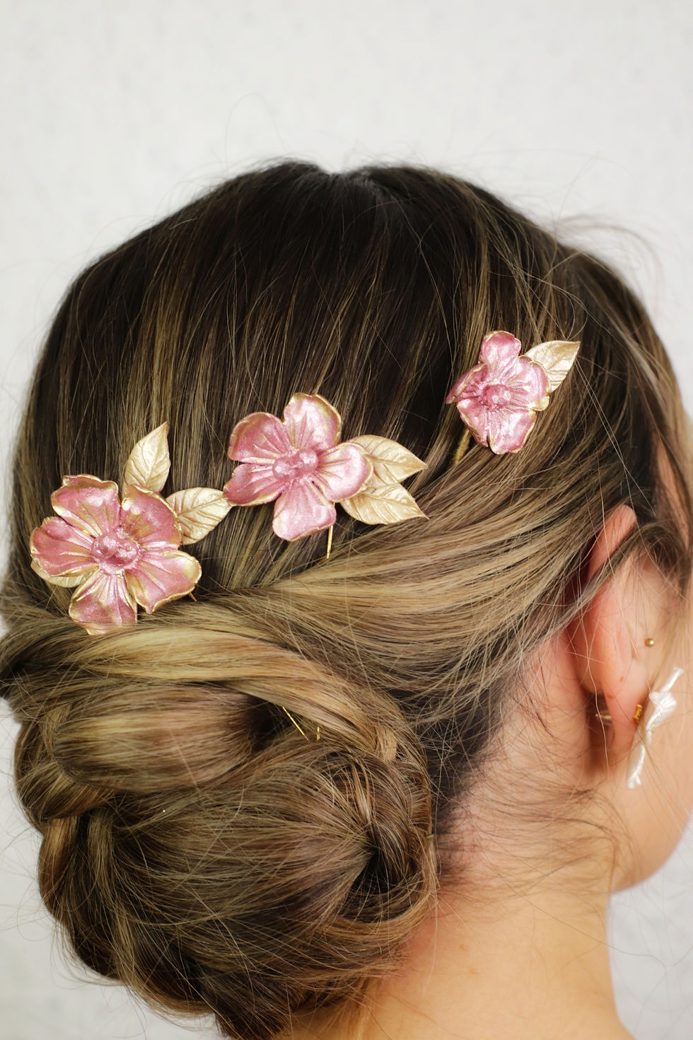 Conjunto peineta flores porcelana rosa y 3 horquillas